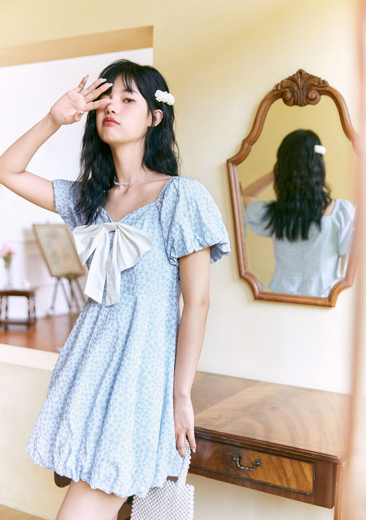 5分鐘前氣質水冰月連衣裙2024新款春蝴蝶結連衣裙方領茶歇裙 - 套餐一 1入-NT$1099